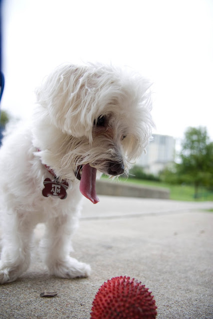 I decided to take Mr. Bentley to the park so we could do his Halloween photo shoot. He's usually very willing to wear clothes, except when it involves something being on his head. So in order for him to cooperate nicely with me, I had to play fetch a few dozen times with his favorite red ball. We've had this ball since the 1st day we brought Bentley home - my 21st birthday - 6/2/2002.